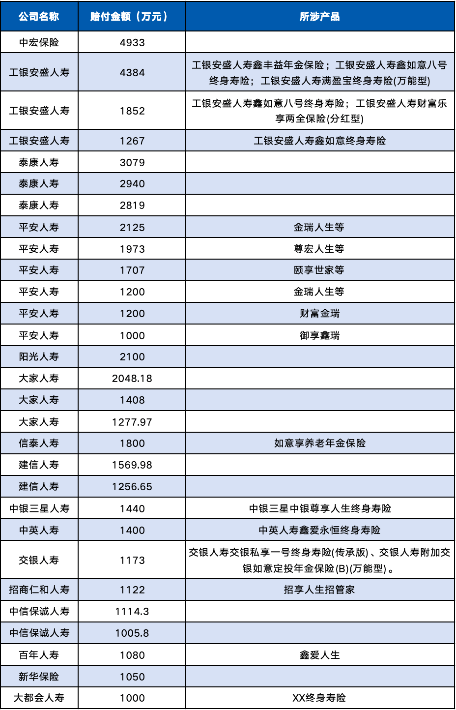 如工银安盛人寿的4384万元大额赔案中,就涉及工银安盛人寿鑫丰益年金保险、工银安盛人寿鑫如意八号终身寿险、工银安盛人寿满盈宝终身寿险(万能型)三款产品;1852万元赔案中涉及工银安盛人寿鑫如意八号终身寿险、工银安盛人寿财富乐享两全保险(分红型)。此外,该公司1267万元赔案的理赔产品是工银安盛人寿鑫如意终身寿险。