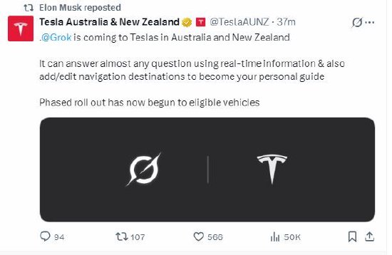 特斯拉开始向澳新地区车主推送Grok服务 lnradio.com 2026年02月24日 08:26 3 0 特斯拉官方账号在X上发帖称:“Grok即将登陆澳大利亚和新西兰的特斯拉汽车。它能够利用实时信息回答几乎任何问题,并且还能添加/编辑导航目的地,从而成为您的私人向导。目前已开始分阶段向符合条件的车辆推送。” 特斯拉CEO埃隆·马斯克转发了这条帖子。