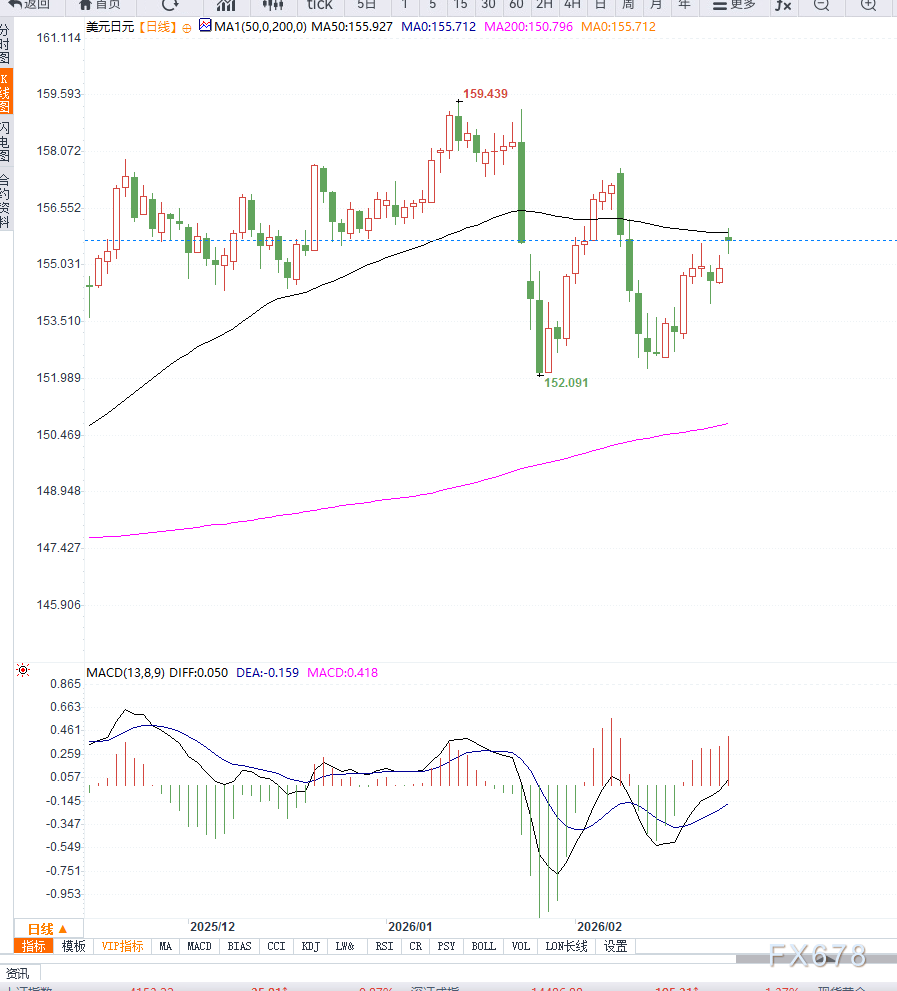 从日线结构看,USD/JPY仍处于高位震荡区间。155.90附近为短期多空平衡区域,价格未能形成趋势性突破。上方关键压力位位于157.00附近,该区域为前期高点与心理关口共振区域。