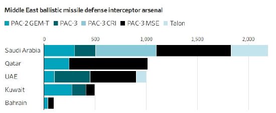 通常需要两枚甚至三枚拦截弹(例如“爱国者”或“萨德”系统所使用的导弹)才能击落一枚弹道导弹。西方官员估计,在本轮冲突开始时,伊朗拥有远超2000枚能够打击海湾国家的导弹。尽管该地区部署的拦截弹具体数量属机密,但Hoffmann根据公开资料计算,阿联酋订购的数量不足1000枚;科威特约为500枚;巴林不足100枚。