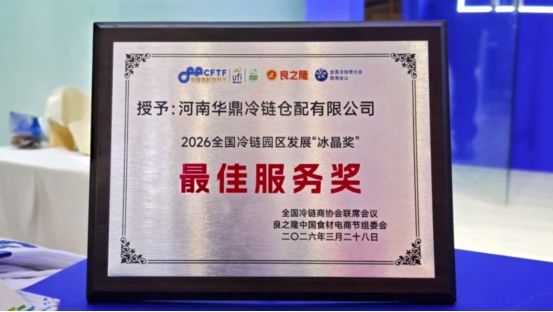 在同期举办的2026全国冷链园区发展大会上,华鼎冷链科技凭借专业的服务能力和科技实力,荣获2026全国冷链园区发展“冰晶奖”最佳服务奖。