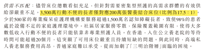 中国60岁及以上人口已突破3.1亿,银发经济规模约7万亿元,2035年有望增至30万亿元。但行业长期存在一个结构性矛盾:低端床位大量空置,真正具备专业失能照护能力的机构却少之又少。全国约有3500万行动不便的老人,对应仅约200万张医养结合床位,比例高达17.5:1。市场上多数养老机构停留在“有个床位、管顿饭、出事打120”的粗放阶段,而真正需要的是能接住老人突发急症、管理慢性病、应对认知障碍的深度服务。