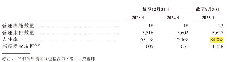 锦欣康养切入的正是这个缺口。它不学泰康做高端保险社区,也不靠政府补贴度日,而是聚焦80岁以上、失能失智的刚需群体,月费4500-5500元,瞄准普通家庭。截至2025年9月30日,锦欣康养运营38家设施、8333张床位,整体入住率84.8%。而民政部数据显示,2024年全国养老机构平均入住率不足50%,部分区域甚至出现床位空置率超60%。