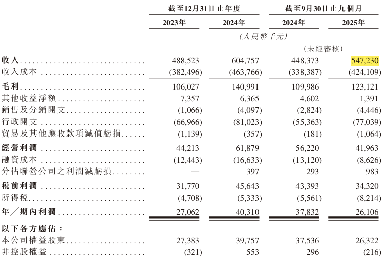 营收增长势头不错。 2023年至2025年前三季度,公司收入从4.89亿元增至6.05亿元,2025年前三季度达5.47亿元。毛利也同步提升,毛利率在2024年达到23.3%。但随着规模扩张,隐忧也开始浮出水面。