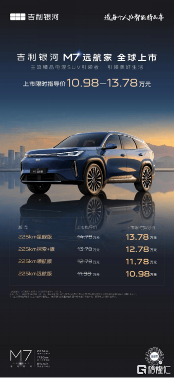 4月28日,“主流精品电混SUV引领者”吉利银河M7远航家正式上市,全系标配长续航225公里。新车共推出4个版型,分别是225km远航版、225km领航版、225km探索+版和225km星舰版,上市限时指导价为10.98万元-13.78万元。即日起,用户可通过吉利银河APP、微信小程序、抖音小程序及官网等官方渠道下定。2026年5月31日(含)前完成大定并提车的用户可享限时超级置换金、五一畅享出行保险补贴,以及上市限时八重权益:焕新礼、金融礼、升舱礼、智行礼、无忧礼、流量礼、交付礼、质保礼等多重福利。