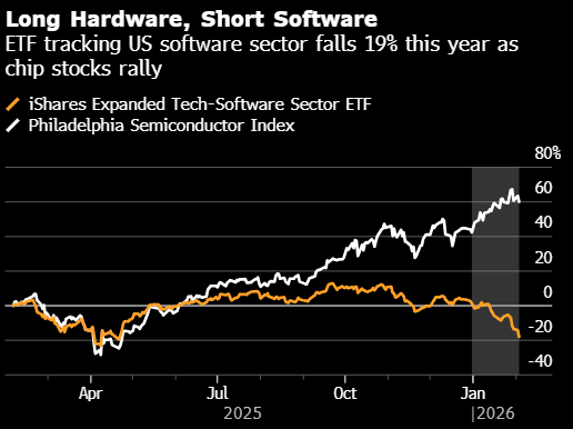 Ogg写道,对软件公司而言,“好于预期的业绩已不足以说服市场”。除非它们“能够无可辩驳地证明,AI对增长是可持续的助推,而不是较长期的阻碍”。