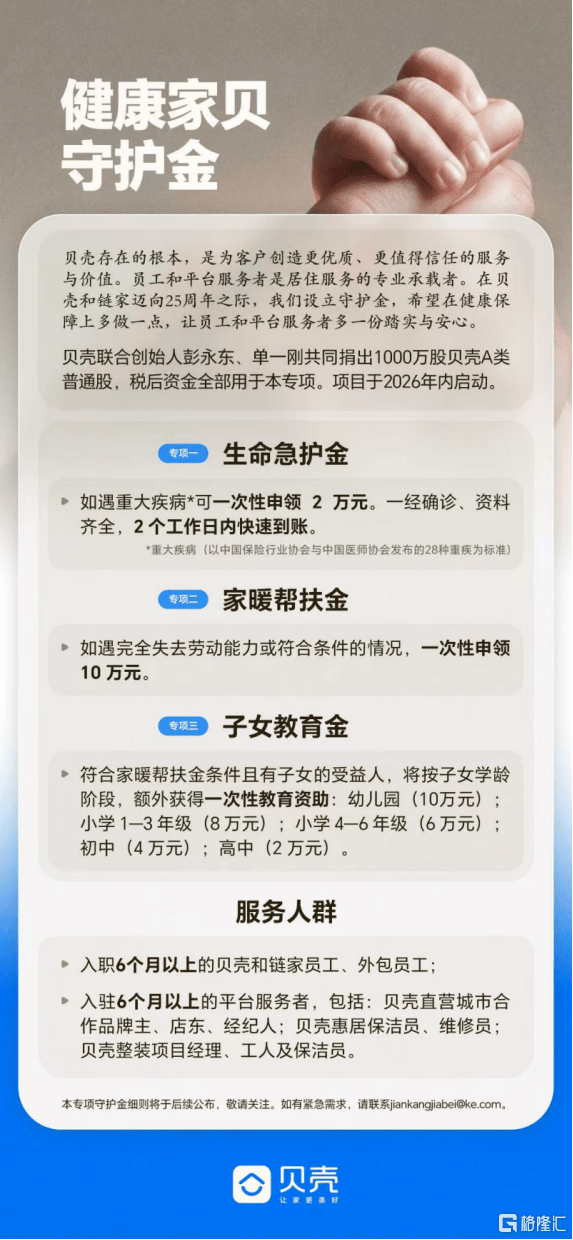 2月24日,贝壳联合创始人、董事长兼首席执行官彭永东和联合创始人单一刚在内部全员信中透露,在贝壳和链家迈向 25周年之际,将共同捐赠1000万股A类贝壳普通股,税后资金将用于设立"健康家贝守护金",作为贝壳和链家员工以及行业服务者约50万人的保障金。按2月23日收盘价,该笔捐赠价值约4亿元,项目将于年内启动。