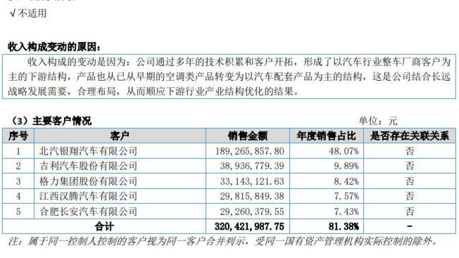 公司从废旧纺织品加工起家,中途跨界进入汽车天窗领域,格力电器(000651)、北汽银翔汽车有限公司(以下简称北汽银翔)、奇瑞汽车都曾是其第一大客户。2024年,公司对奇瑞的销售额占比超过八成。