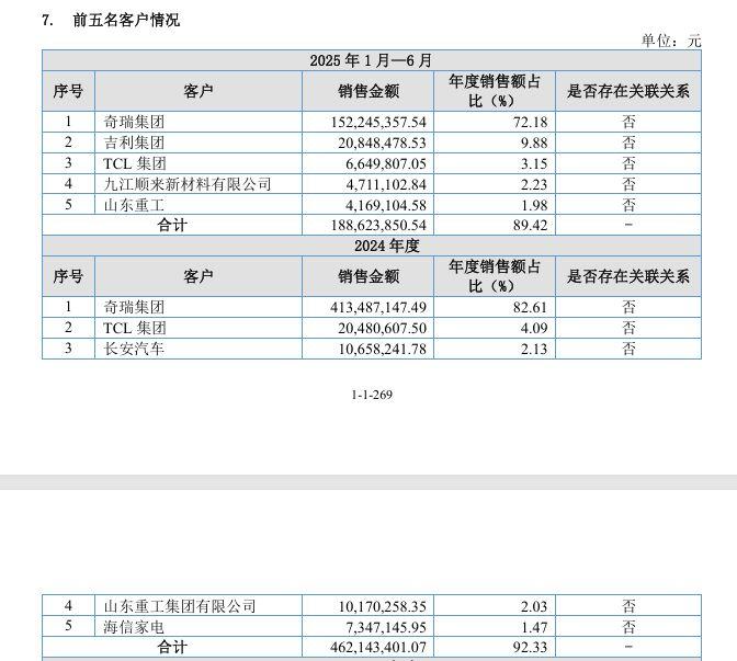 报告期内,天运股份对奇瑞汽车的销售占比从2022年的29.81%猛增至2024年的82.61%,虽然在2025年上半年略有回落至72.18%,但仍处第一。