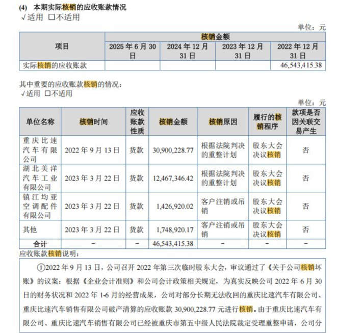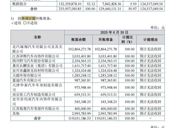 在这背后,是一笔笔艰难的回款。截至2025年上半年末,公司单项计提坏账合计仍达1.19亿元。这些资金主要“套牢”在那些已经破产或陷入经营困境的客户身上,如北汽瑞翔汽车有限公司(前身为北汽银翔)等。