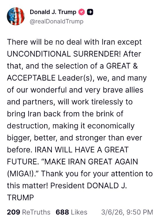 特朗普希望伊朗“无条件投降” 排除达成协议可能性 lnradio.com 2026年03月06日 22:47 6 0 特朗普Truth Social发帖称,“除非无条件投降,否则不会与德黑兰达成任何协议”。 “在那之后,通过选出一位(或几位)很棒且美国可接受的领导人,我们和许多非常优秀勇敢的盟友和伙伴将不遗余力地把伊朗从毁灭边缘带回来”。