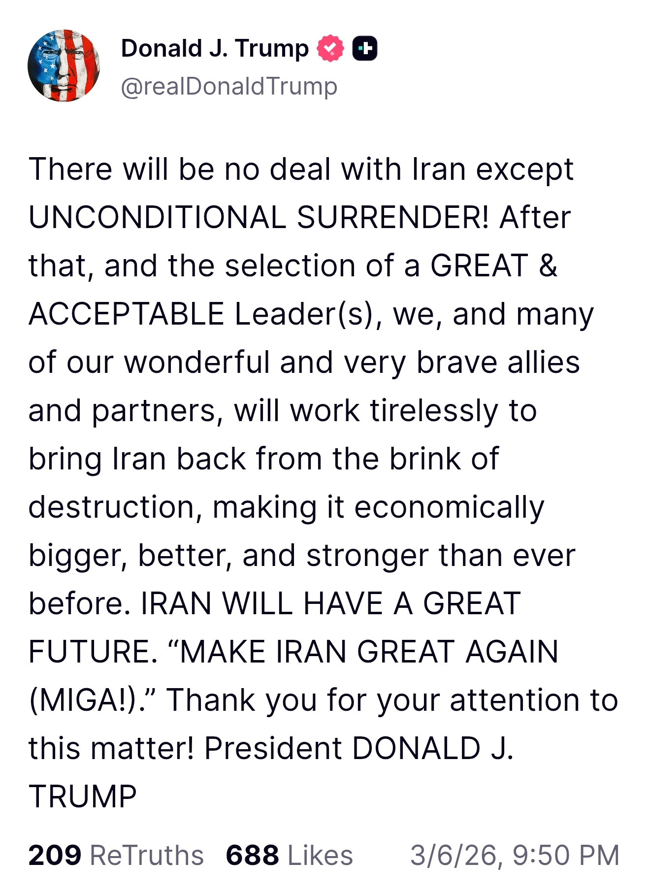 “除非伊朗无条件投降,否则绝无协议!”特朗普写道。“此后,在选出伟大且被接受的领导人后,我们将与众多优秀而勇敢的盟友伙伴携手,不懈努力使伊朗摆脱毁灭边缘,使其经济规模更庞大、更繁荣、更强大。”