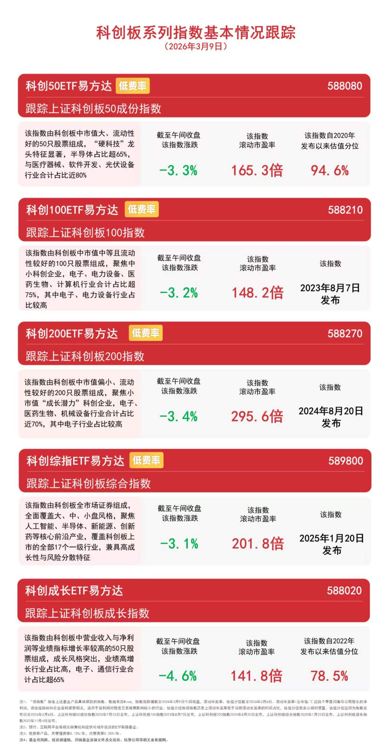 截至午间收盘,科创综指下跌3.1%,科创100指数下跌3.2%,科创50指数下跌3.3%,科创200指数下跌3.4%,科创成长指数下跌4.6%。