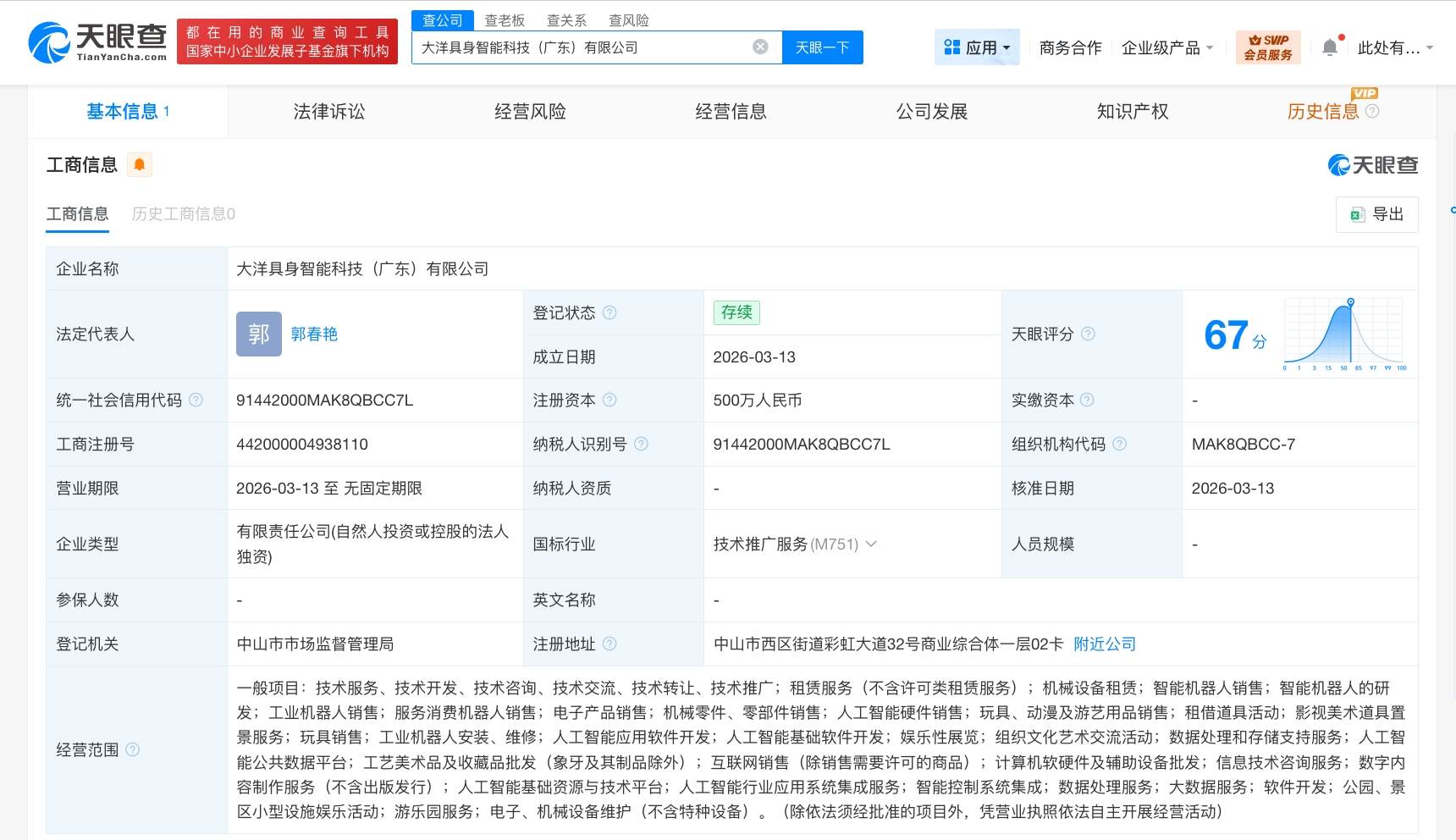 天眼查工商信息显示,近日,大洋具身智能科技(广东)有限公司成立,法定代表人为郭春艳,注册资本500万人民币,经营范围包括智能机器人的研发、智能机器人销售、工业机器人销售、人工智能硬件销售、人工智能应用软件开发等。股东信息显示,该公司由大洋电机(002249)全资持股。