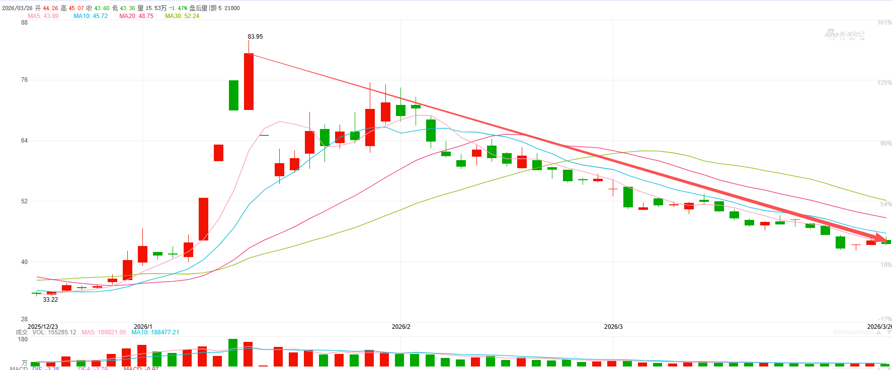 然而,这一轮暴涨在1月14日戛然而止。当日公司发布澄清公告,明确表示“不涉及GEO业务”,公司主营业务是为企业提供出海整合营销、数字营销等服务。公告发布后,股价从年内高点83.95元/股迅速回落。截至3月26日收盘,公司股价报43.60元,较高点回撤幅度达48%,市值蒸发约187亿元。