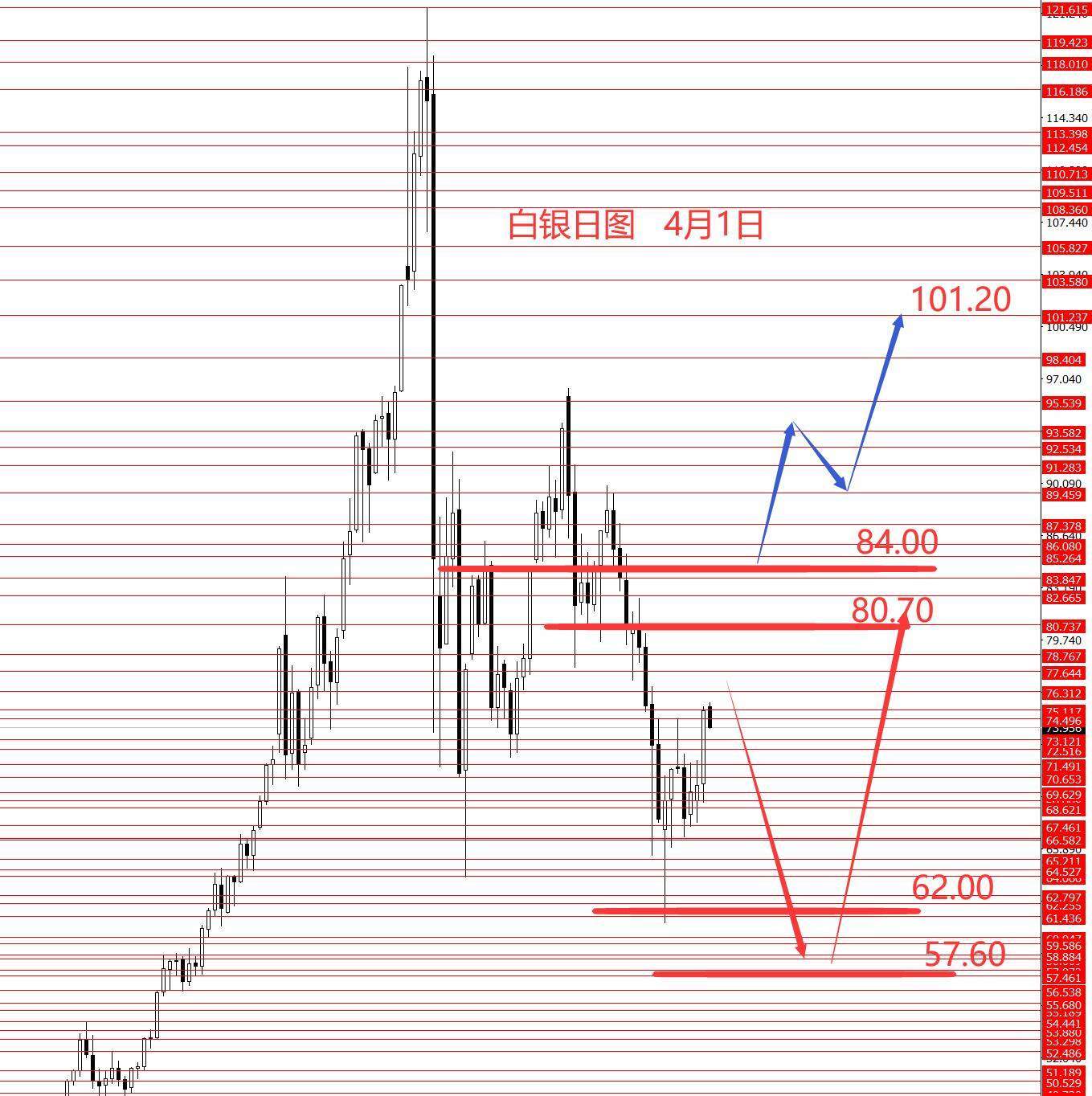 白银三月正如预期反转下行,89.50二次探顶下跌,目标75.10和73都已到位,最低61附近企稳震荡。从图形来看,白银本月二次探底的概率较大些,甚至再创新低的可能,上方重点关注78.50和84.00区域的强阻力,在84没上破前,二次探底的概率较大些,下方重点关注62附近,如果创新低则关注57.60区域。白银只有成功站稳84.00上方,才能打开另一个上涨空间,向上测试94和101和概率才会加大。今日一样只有框架分析,没有具体操作建议。