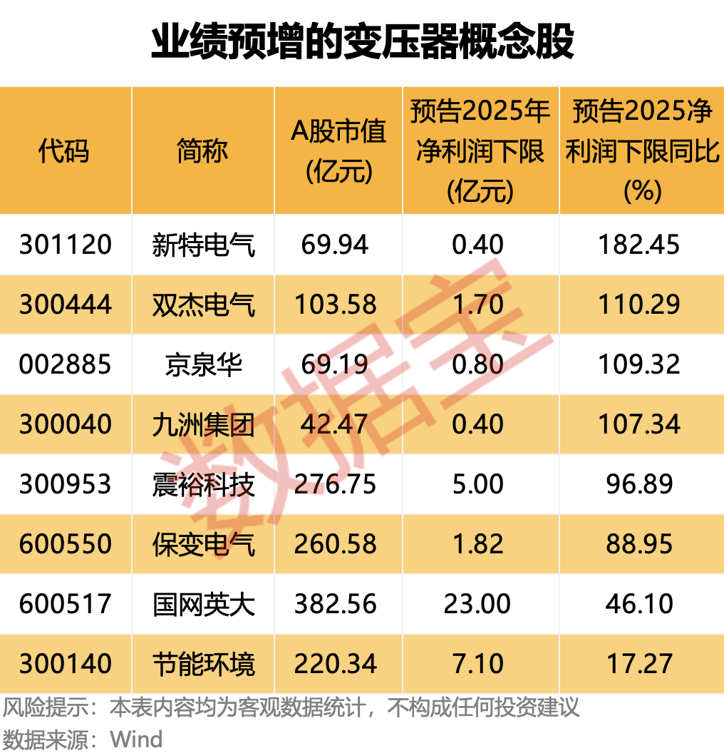 从已披露的业绩预告数据来看,按照业绩预告净利润下限计算(若无下限则取公告数值),8只变压器概念股2025年净利润有望同比增长(含扭亏为盈),包括新特电气、双杰电气、京泉华(002885)、九洲集团、震裕科技等。