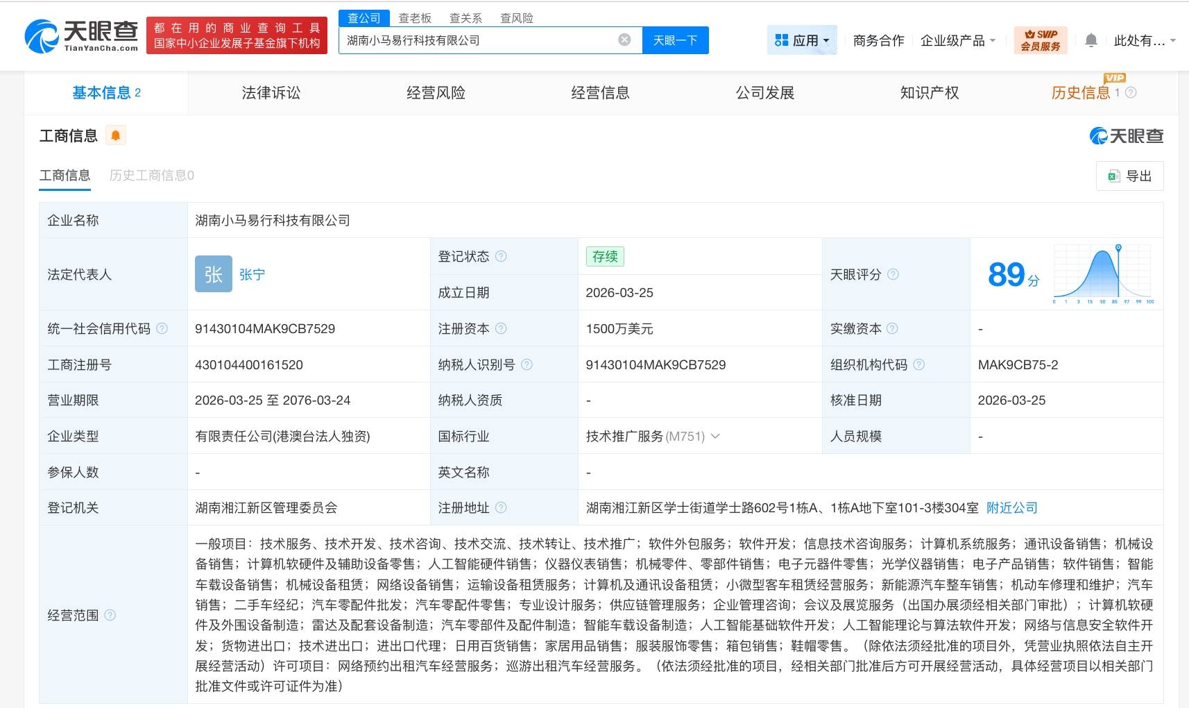 天眼查工商信息显示,近日,湖南小马易行科技有限公司成立,法定代表人为张宁,注册资本1500万美元,经营范围包括网络预约出租汽车经营服务、人工智能基础软件开发、智能车载设备制造、新能源汽车整车销售等。股东信息显示,该公司由香港小马智行有限公司全资持股。