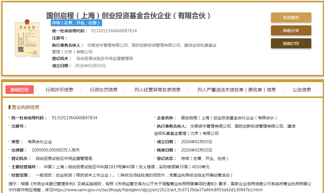 记者从天眼查获悉,近日,国创启程(上海)创业投资基金合伙企业(有限合伙)正式成立,出资额100亿元,经营范围包含创业投资(限投资未上市企业)。