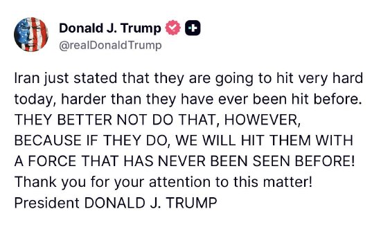 特朗普发文:伊朗最好别这么做 lnradio.com 2026年03月01日 15:42 3 0 特朗普在社交媒体发文:伊朗刚刚宣称他们今天要发动非常猛烈的打击,比以往任何时候都要猛烈。他们最好别这么做。如果伊朗这么做,我们将以史无前例的武力打击他们。