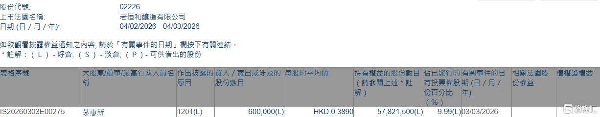 格隆汇3月4日丨根据联交所最新权益披露资料显示,2026年3月3日,老恒和酿造(02226.HK)遭股东茅惠新在场内以每股均价0.389港元减持60万股,涉资约23.34万港元。