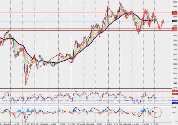 技术面:美元兑日元H4级别持续回落,并在48日多空分界线下方运行。此外,MACD双线和量能柱在零轴上方扩张。日元出人意料的疲软凸显了日本经济的根本性转变和脆弱性。市场在消化高市早苗的大规模支出计划及其抵制日本央行进一步加息的立场。