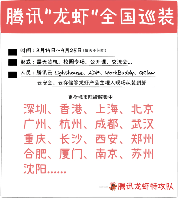 在未来40天,腾讯云Lighthouse、ADP、WorkBuddy、QClaw、云安全、云存储等龙虾产品的主理人和技术专家,将奔赴深圳、香港、上海、北京等17个城市,免费为用户提供安装部署、模型配置、技能安装、正式使用、卸载清理(如果用户需要)的一条龙服务。