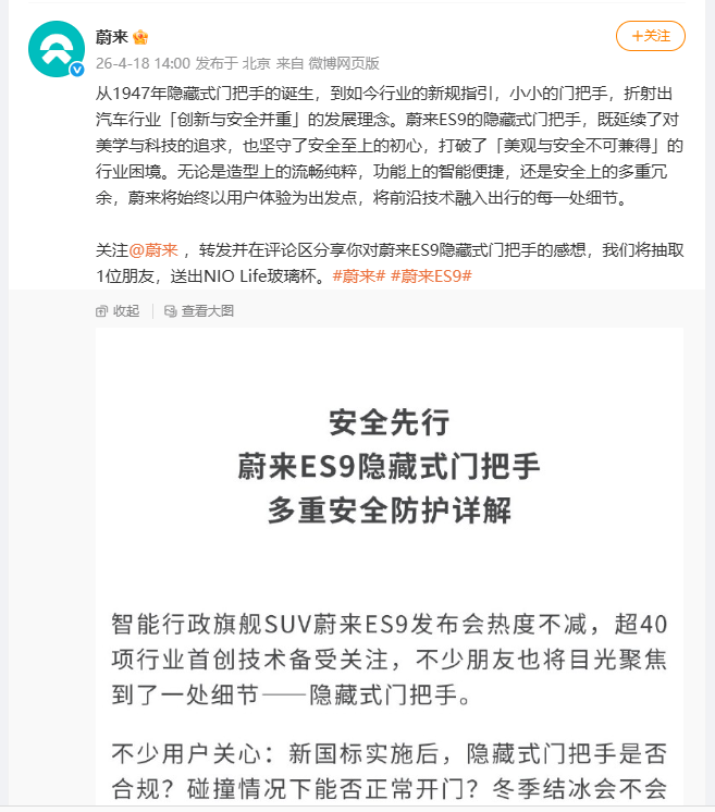 每经AI快讯,4月18日,蔚来汽车发文回应了关于新国标实施后,ES9的隐藏式门把手是否合规等问题:目前蔚来全系在售车型,均可以正常使用隐藏式门把手,也完全合规。对于“禁止隐藏式把手”的条目,新国标的实施时间要求:2027年12月31日之前上公告的全新车型都可以使用隐藏式把手,2028年12月31日之前出厂的现款/改款车型都可以使用隐藏式把手。蔚来表示,坚决支持车内外把手的规范化管理,并持续以高于行业标准的要求约束自身。对于后续车型的设计,蔚来会严谨研究新法规要求,确保所有车型均符合新规;而当前在售车型的安全性,早已通过严苛测试,完全值得用户信赖。
