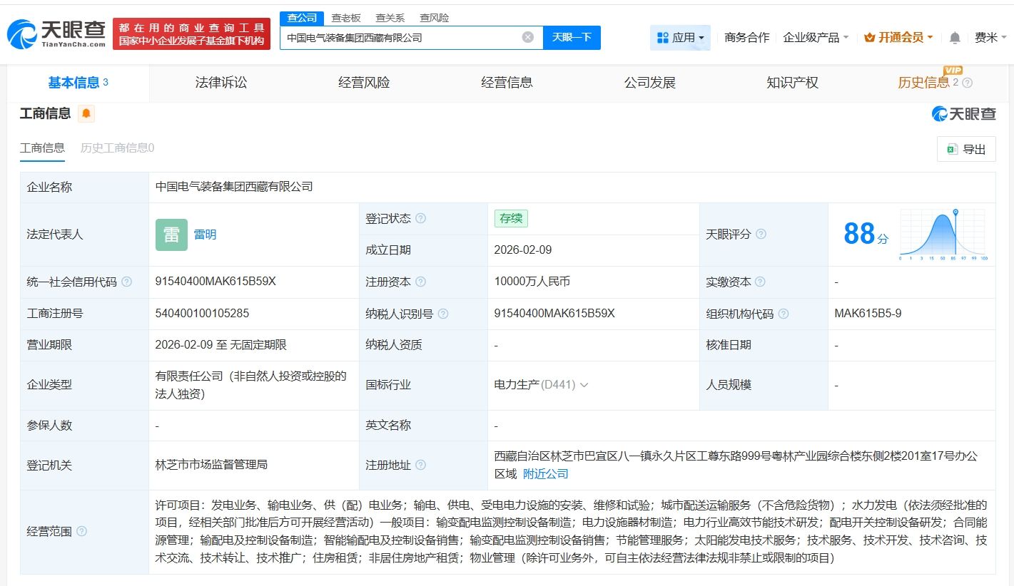 中国电气装备集团在西藏成立新公司 注册资本1亿 lnradio.com 2026年02月10日 15:08 4 0 天眼查App显示,近日,中国电气装备集团西藏有限公司成立,法定代表人为雷明,注册资本1亿人民币,经营范围包括输变配电监测控制设备制造、电力设施器材制造、电力行业高效节能技术研发等,由中国电气装备集团有限公司全资持股。