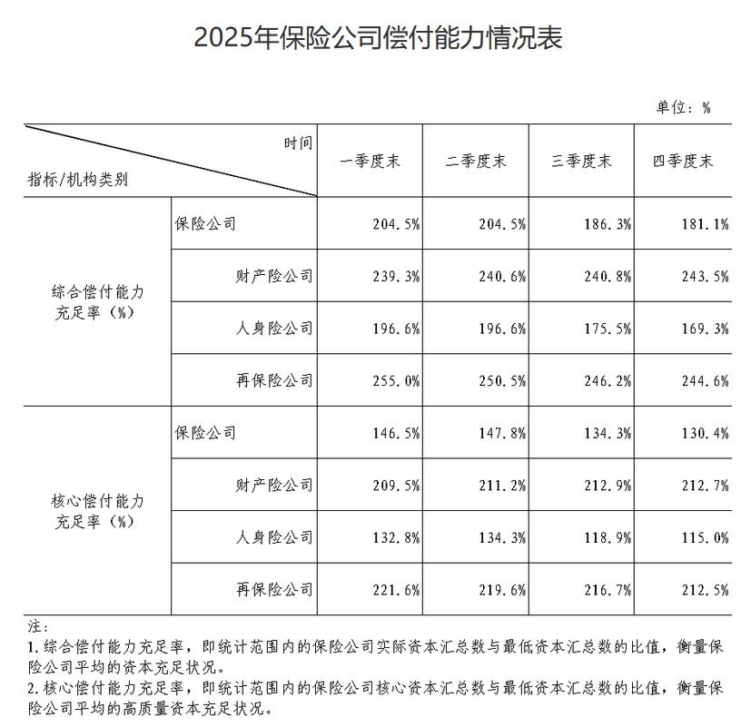 金融监管总局:四季度末保险公司核心偿付能力充足率130.4% lnradio.com 2026年02月12日 20:19 6 0 2月12日金融一线消息,国家金融监督管理总局发布2025年保险公司偿付能力情况。四季度末保险公司综合偿付能力充足率181.1%,核心偿付能力充足率130.4%。