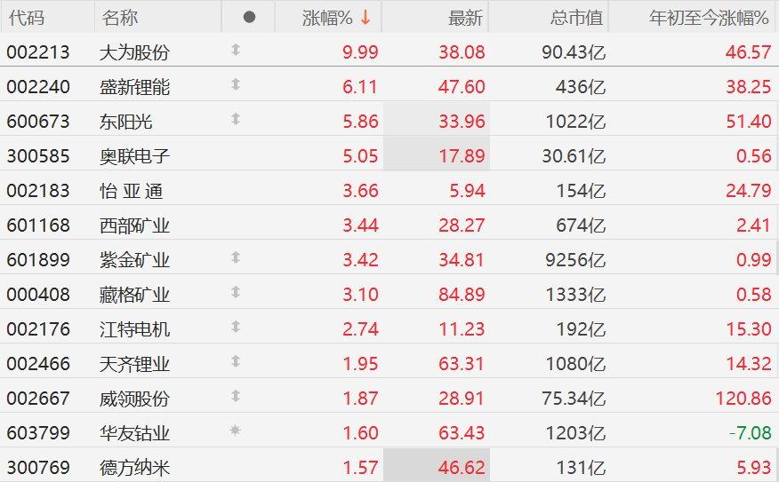 A股市场锂矿股集体上涨,其中,大为股份10CM涨停,盛新锂能涨超6%,东阳光、奥联电子涨超5%,怡亚通、西部矿业、紫金矿业、藏格矿业涨超3%。消息面上,碳酸锂主力合约今日盘中一度涨4%,报168400元/吨。