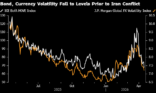 自3月下旬以来,衡量债券、货币和股票波动的主要指标几乎每天都在下降,因市场愈发乐观地认为,美国与伊朗正朝着达成协议迈进。