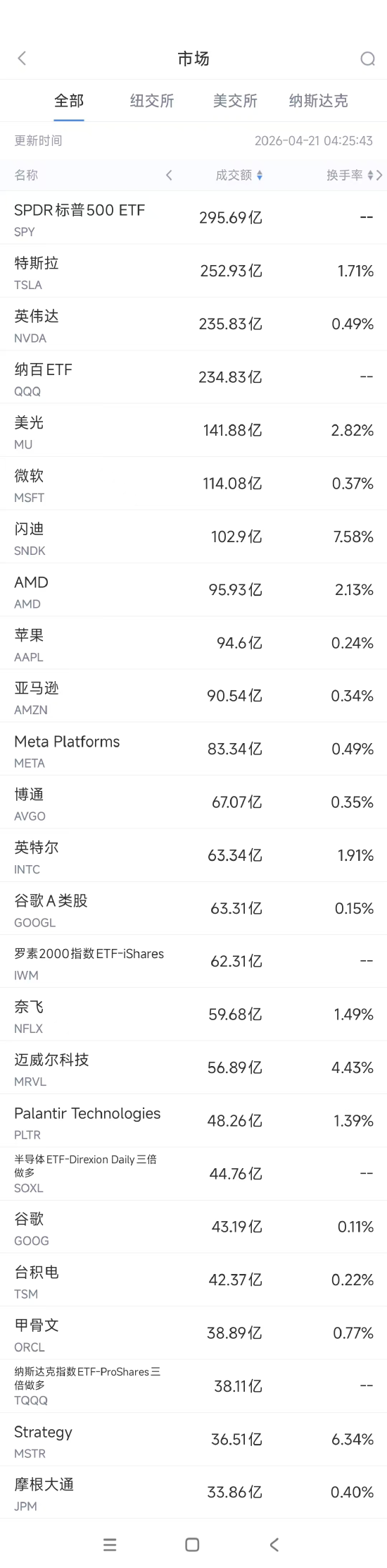 第13名Netflix收跌2.55%,成交59.68亿美元。该公司于4月16日公布了2026年第一季度业绩,华尔街反应偏空。尽管当季表现相对稳健,但谨慎的业绩指引令财报失色,导致股价承压。不过,摩根士丹利分析师并未动摇,依然坚定看多这家流媒体巨头的股票。该行重申对Netflix的“超配”评级,并维持115美元的目标价。