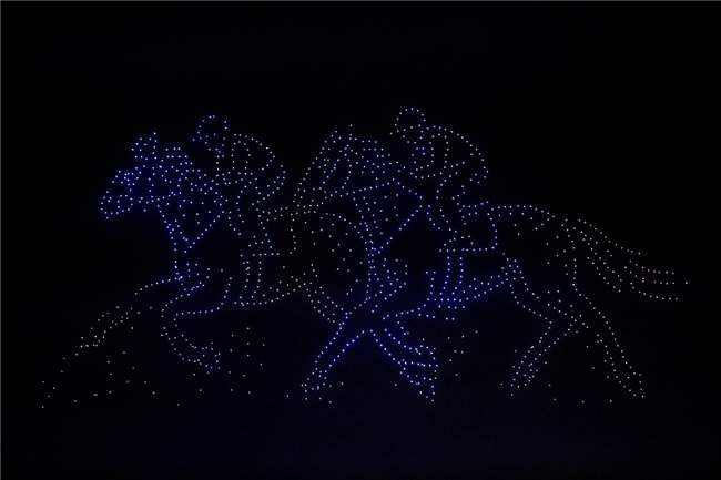 启动仪式后,万众期待的低空光影秀震撼登场。1200架无人机腾空而起,在流溪河上空精准编队,依次变幻出香港赛马会标志和吉祥物、“两地三马场” 的字样、“马年新春”祥瑞字样以及象征从化生态瑰宝的“世界珍稀温泉”等动态画面。光影流转间,一幅融合湾区活力与岭南风韵的空中画卷徐徐展开,引人赞叹。