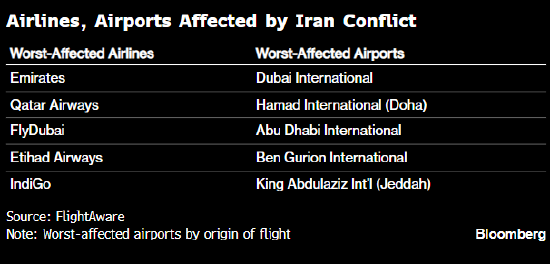 根据FlightAware的数据,迪拜国际机场和多哈哈马德国际机场是受影响最严重的机场,两座机场均已暂停所有航班运营。作为阿联酋航空的大本营、也是全球最繁忙的的国际机场,迪拜国际机场已有超过600个出港航班被取消。