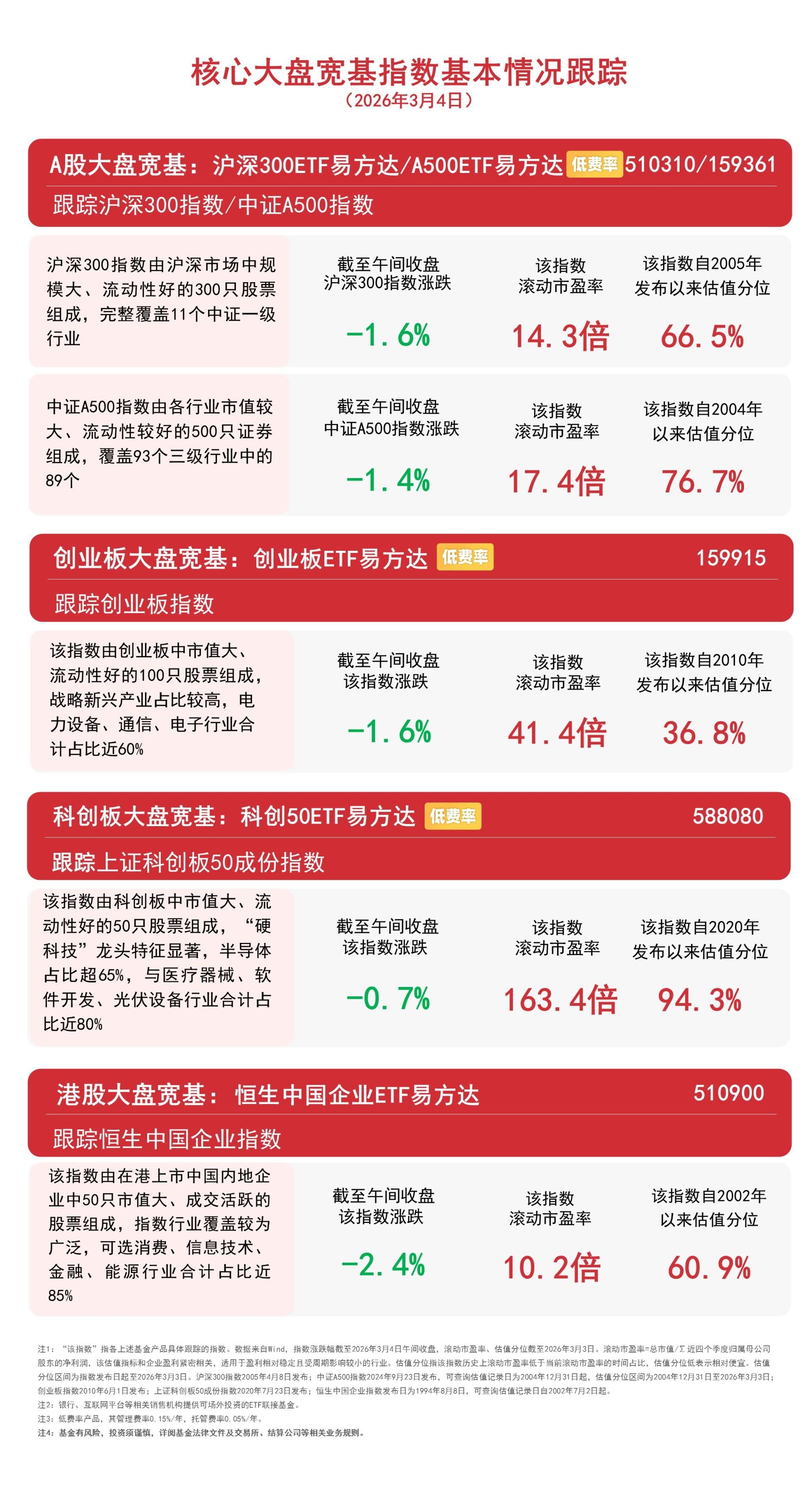 截至午间收盘,中证A500指数下跌1.4%,沪深300指数、创业板指数均下跌1.6%,上证科创板50成份指数下跌0.7%,恒生中国企业指数下跌2.4%。