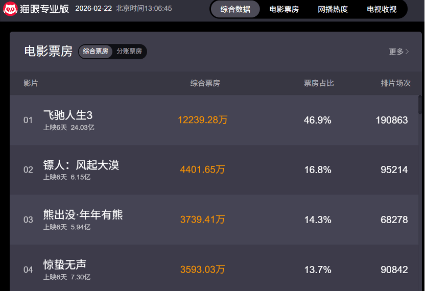 截至2月22日13时左右,《飞驰人生3》票房已经冲破24亿元,以绝对优势领跑,这也是今年春节档首部票房迈入20亿大关的影片。此外,《惊蛰无声》《镖人:风起大漠》两部影片也分别突破7亿元、6亿元票房。据灯塔专业版,截至2月22日18时,2026年春节档档期总票房(含预售)突破50亿元。