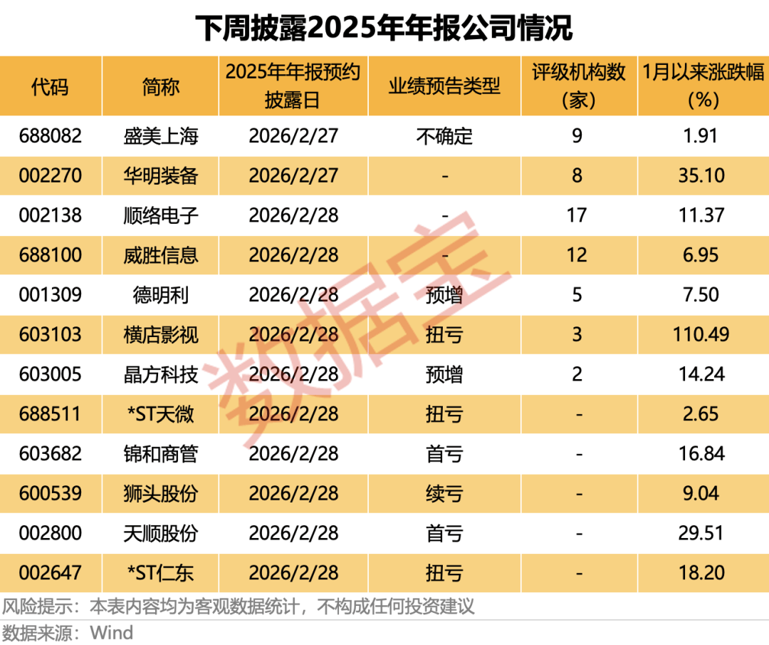 根据公告,横店影视2025年年报预约披露日为2026年2月28日,这意味着公司下周将发布2025年年报。此外,还有华明装备(002270)、盛美上海等10多家公司预计也将于下周发布2025年年报。