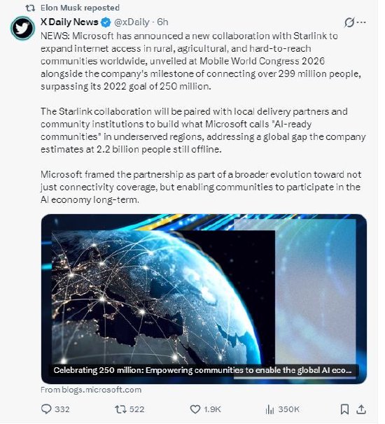 SpaceX首席执行官埃隆·马斯克转发了一位用户在社交平台X上分享的这一消息。该帖子称:“微软宣布与星链展开新的合作,旨在扩大全球农村、农业和偏远地区的互联网接入。该合作在2026年世界移动通信大会(MWC)上公布,同时微软也宣布实现了其网络连接人数超过2.99亿的里程碑,超过了其2022年设定的2.5亿的目标。