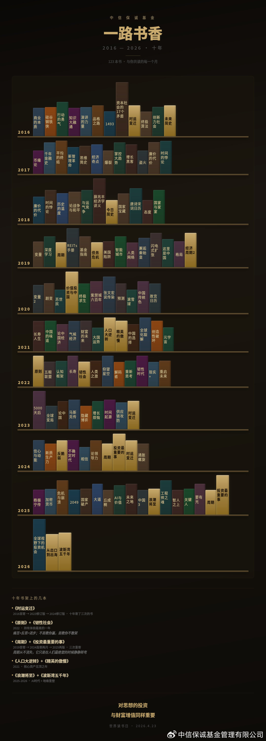 选书逻辑上,项目不追逐短期市场热点,而是聚焦长期认知框架的构建。十年间所选书目跨越金融史、行为经济学、周期理论、地缘政治、产业变迁等多个领域,代表书目包括《时运变迁》《未来简史》《原则》《韧性社会》《周期》《波斯湾五千年》《从出口,到出海》等。项目旨在帮助投资者在市场波动中建立理性思考的习惯,提升其对市场周期、结构性变迁及自身情绪管理的认知能力。