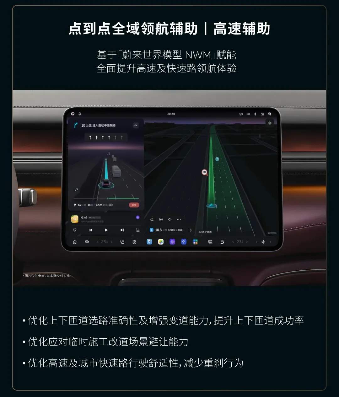 在智能辅助驾驶方面,基于“蔚来世界模型NWM”的点到点全域领航辅助功能得到增强。城区道路新增效率换道,优化了变道果断性与路口通过能力;高速场景则提升了上下匝道成功率及施工路段避让能力。新增的非固定车位收藏功能允许车辆在抵达目标区域前沿途自动搜寻车位并泊入,同时支持预约遥控泊入。