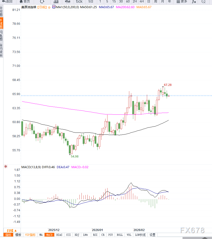 成品油库存则呈现分化,汽油库存减少100万桶,显示终端消费仍具一定韧性,而馏分油库存增加25.2万桶,反映工业与运输需求修复力度有限。尽管库存数据显著利空,但油价并未出现深度下挫,原因在于地缘局势不确定性持续支撑风险溢价。新一轮核问题谈判将在日内瓦举行,美国总统唐纳德・特朗普重申不会允许伊朗拥有核武能力,使市场对中东供应中断的担忧升温。同时,沙特阿拉伯据称已准备短期增产预案,以防潜在冲突影响出口。OPEC+方面也传出可能在4月增产13.7万桶/日的消息。从日线结构观察,WTI原油当前仍处于中期震荡区间内部运行,价格波动核心区间维持在60美元至72美元之间。近期油价连续回落但跌幅有限,说明下方承接力量仍在发挥作用。20日均线走平,价格围绕均线反复震荡,显示短期趋势缺乏方向性突破;50日均线位于63美元附近,构成中期动态支撑。动能指标RSI位于50中轴附近,既未进入超买区也未触及超卖区,反映市场情绪处于平衡状态。当前65美元位置属于区间中轴区域,多空力量相对均衡。若库存压力持续释放并叠加OPEC+增产兑现,油价可能下探63美元一线,进一步支撑位在60美元整数关口;若地缘风险升级推动突破67.5美元,则上方目标将指向70美元甚至72美元区域。整体技术形态尚未形成趋势性突破,震荡格局依然是主基调。