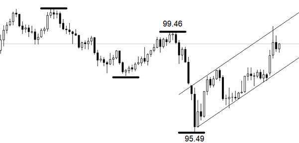 行情方面。日线级别,美元指数处于上涨波段:中期高点为99.46点,中期低点为95.49点,两个关键点位构成美元指数中短期的中枢区间。本周之前上涨波段一直运行于中枢区间内部,本周二,受美伊冲突影响,美元指数飙涨至99.66,突破中期高点。市价已经和通道线上轨交叉,未来数日可能出现短线回落走势。褐皮书的发布对美元指数的影响偏向长期,日线级别行情并未有大幅波动。