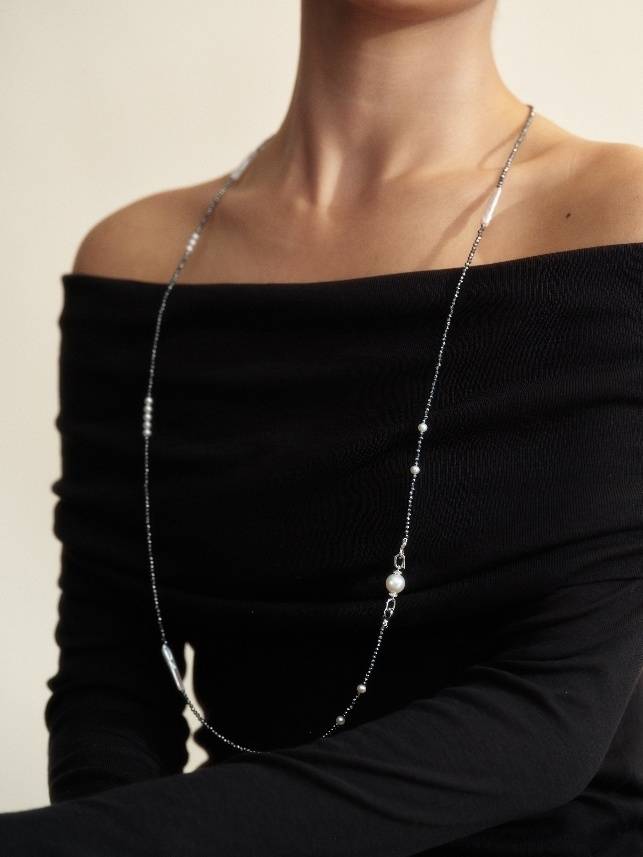 当自然之柔与几何之刚相遇,便有了“金属城市-液态棱镜多功能链”的创新表达。这款项链打破单一设计语言的束缚:链身的每一颗灰尖晶石采用几何刻面工艺,光线照射时,可折射出如棱镜般的璀璨光泽,自带建筑的理性质感;点缀的珍珠则留存自然的温润,中和几何的清冷。更具巧思的是其多功能设计,可根据场景调整长度,既能作长链垂坠胸前,亦可缠绕两圈化作短链,甚至作为手链使用。这份动态设计,让自然珠光与几何刻面在不同佩戴方式中相互呼应,既满足日常穿搭的实用性,又彰显MiNG名皇珠宝设计思考的广度。