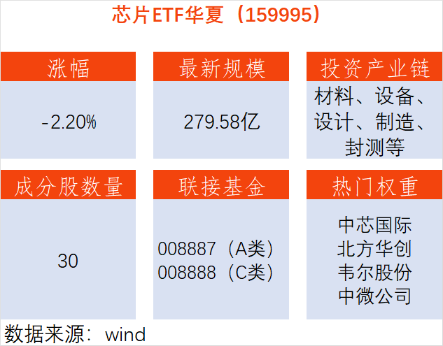 资料显示,芯片ETF华夏(159995)跟踪国证芯片指数,30只成分股集合A股芯片产业中材料、设备、设计、制造、封装和测试等龙头企业,其中包括中芯国际、寒武纪、长电科技、北方华创等。其场外联接基金为,A类:008887;C类:008888。