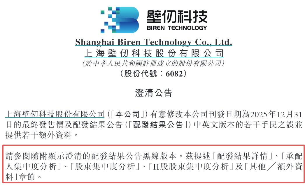 事实上,这并非今年港股市场首例新股配发公告错误事件,2026年以来港股已有3只新股刊发配发结果澄清公告,分别为飞速创新、壁仞科技及优乐赛共享。其中优乐赛共享仅出现一处手数错误,而飞速创新与壁仞科技均存在多项核心内容错误,壁仞科技更是在配发结果详情、承配人集中度分析等五大核心章节出现纰漏,且这两家出现严重公告错误的企业,联席保荐人均包含中金公司。
