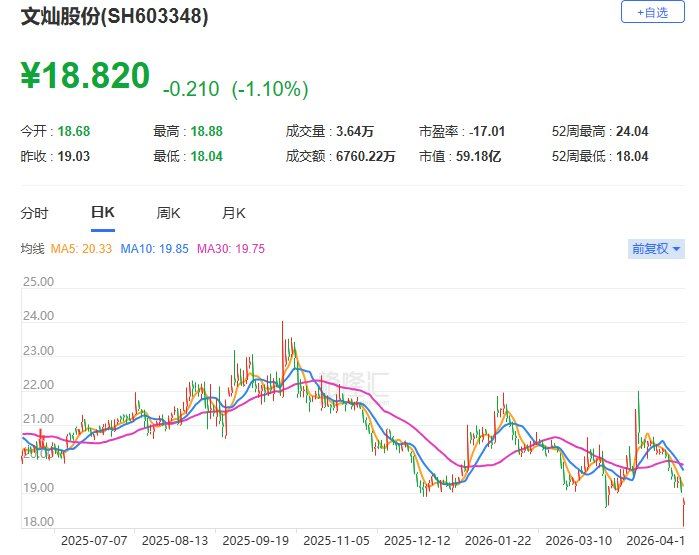 文灿股份(603348.SH)一度跌5.2%至18.04元,股价创2020年7月28日以来近6年新低。文灿股份公告称,2026年第一季度实现营业收入13.12亿元,同比增长3.26%;归属于上市公司股东的净利润亏损7977.58万元,上年同期盈利386.03万元,同比转亏。(格隆汇)