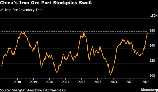 上海钢联电子商务股份有限公司周五发布的港口样本数据显示,中国港口铁矿石库存已连续第十周回升,环比增加0.6%至1.6亿吨,创2022年以来新高,且逼近2018年历史峰值。库存持续走高或也受到必和必拓集团与中国矿产资源集团定价分歧的影响。