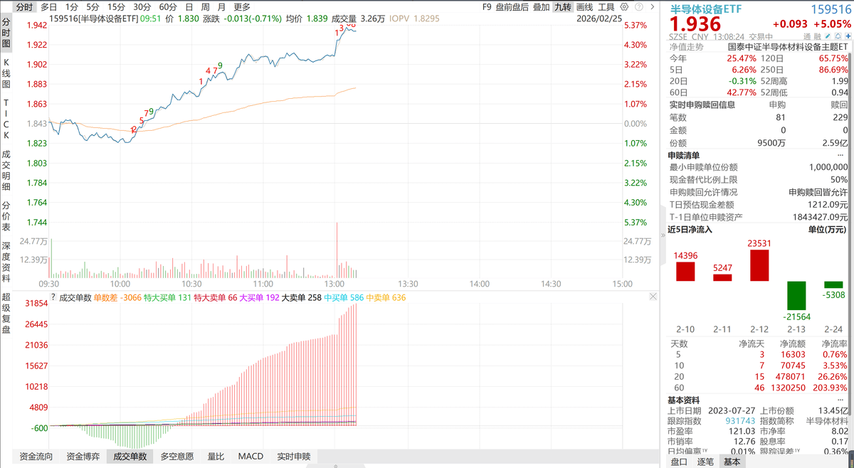 半导体设备ETF(159516)紧密跟踪中证半导体材料设备主题指数(931743),精准聚焦半导体设备与材料两大核心赛道,覆盖刻蚀、薄膜沉积、量测、清洗、硅片、特种气体、光刻胶等芯片上游关键环节,是布局半导体设备赛道的核心工具。该ETF持仓纯度极高,一键打包北方华创、中微公司、拓荆科技、华海清科、沪硅产业等国内设备与材料龙头企业,前十大重仓股权重集中,行业代表性强,能够精准捕捉板块上涨行情。交易层面,该产品为场内ETF,支持T+1交易,买卖灵活便捷,日均成交额充裕,流动性表现优异,投资者可轻松进行波段操作与长期配置。同时,该ETF具备分散风险、降低投资门槛的优势,无需深入研究细分技术、订单与财报,低成本一键布局高壁垒硬科技赛道,有效规避个股非系统性风险,适合各类投资者参与。此外,该基金管理费率低廉,运作透明,紧密跟踪指数,力求最小化跟踪误差,为投资者提供纯粹的赛道beta收益。