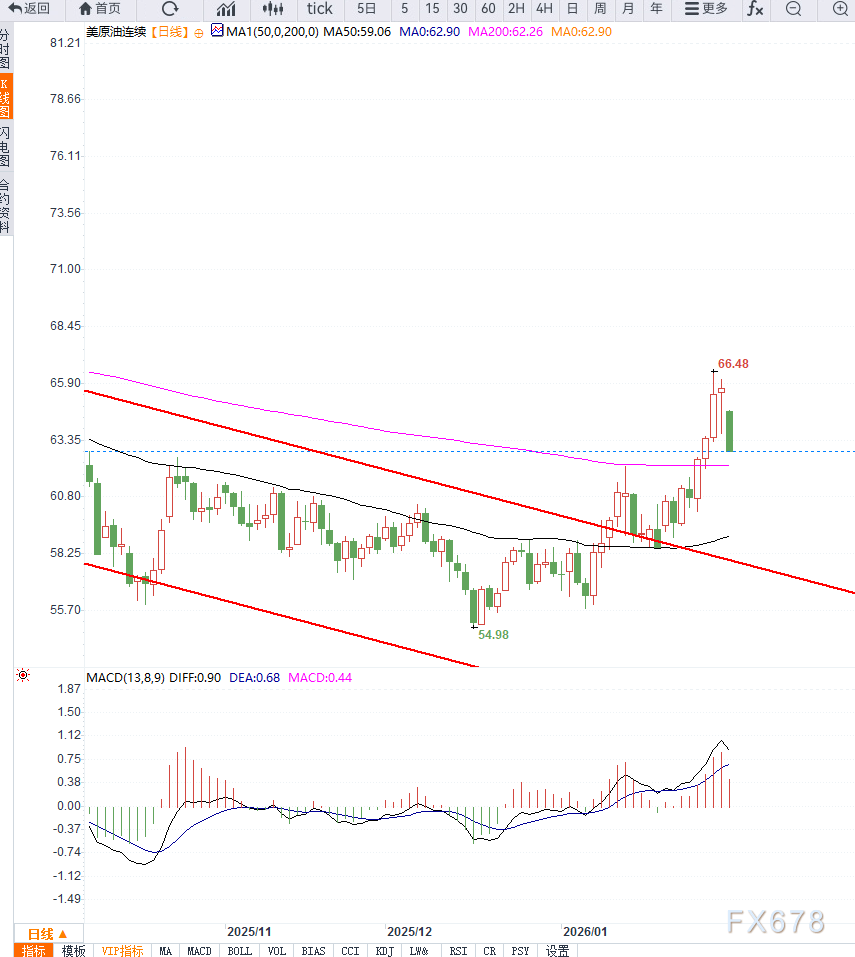 美国方面提出与委内瑞拉分享石油收益,并推动其能源出口逐步恢复,同时建议印度增加采购委内瑞拉原油,以替代部分伊朗及俄罗斯供应。委内瑞拉在放宽私人投资限制后,产能修复与出口恢复预期升温,但考虑到基础设施、资金与执行层面的限制,其短期内难以形成大规模增量供应,更多体现为对未来供给结构的调整预期。与此同时,印度正加快推进原油进口多元化,俄罗斯原油在印度市场的份额被压缩,被迫以大幅折价销售,财政承压加剧。能源贸易结构的重塑在过渡阶段反而加大了供应链摩擦,使市场对短期供应稳定性的信心下降。地缘政治风险同样成为本轮油价反弹的重要推手。美国对伊朗方向的军事与政治姿态明显趋紧,使市场重新评估潜在的供应中断风险。伊朗原油产量在全球供应中占据重要比例,即便实际减供尚未发生,相关风险也迅速转化为价格中的风险溢价。资金在这一阶段选择提前布局,以应对潜在的不对称上行风险。与此同时,覆盖美国大范围地区的极端寒潮对能源系统造成实质性冲击。严寒天气迫使墨西哥湾沿岸多家炼厂减产或停工,部分国内原油生产也受到影响,高峰时期产量损失接近每日200万桶。供应端收缩的同时,取暖需求快速上升,带动成品油需求走强,柴油市场率先转为净多头结构。供需两端同时受扰,使现货市场对即期供应的紧张预期显著升温。在上述因素共振下,资金管理机构与对冲基金明显加快多头建仓步伐,布伦特与WTI原油的净多头头寸升至数月高位。衍生品市场同样释放出偏多信号,看涨期权隐含波动率持续高于看跌期权,显示交易员为潜在的价格上行风险支付溢价。期货曲线走陡、近月合约升水扩大,反映市场对短期供应偏紧的定价逻辑正在强化。从美原油日线图形来看,价格在前期回调后逐步企稳,并重新站回中期均线区域,日线结构呈现低点抬升的修复特征。短期均线拐头向上并与价格形成支撑,显示多头重新掌握主动权,但中长期均线仍需进一步跟随,趋势确认仍在进行之中。动能指标同步回升至中性偏强区间,尚未进入明显超买状态,表明价格仍具一定上行空间,但后续突破需要成交量与基本面事件配合。从关键位置看,上方65至67美元区间构成重要阻力带,若有效突破并站稳,油价有望进一步向70美元附近延伸;下方62美元一线则是短期重要支撑,若失守,意味着本轮反弹可能演变为区间震荡中的技术修复。